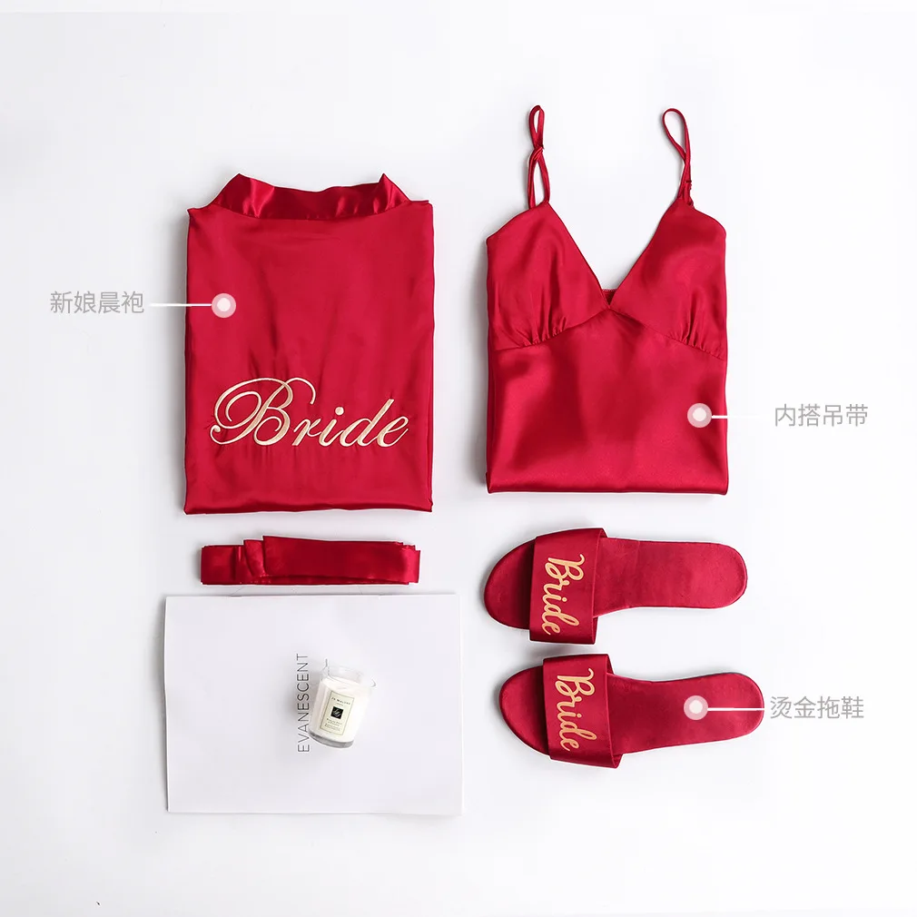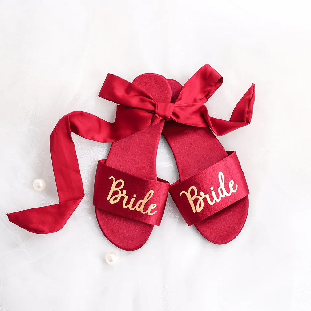 HOT SALE Marriage Bride Bridesmaid Silk Bronze Slipper Souvenir Morning Gowns Slipper Silk Wine Red Bright R